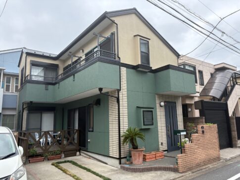 調布市の木造モルタル住宅をベージュ&グリーンで塗装しました!