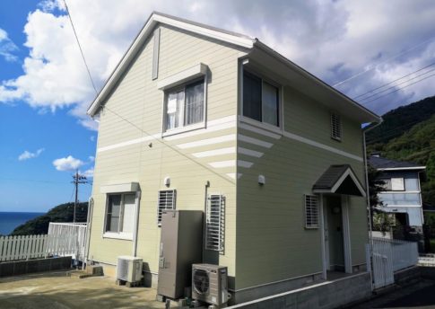 お客様が一目ぼれしたナチュラルグリーンを外壁に。海が一望できる立地でしたので海にもナチュラルグリーンにも映えるクリスマスホワイトでアクセントをつけました。はじめは上部にラインだけのご提案で決まっていましたが、途中でなん...