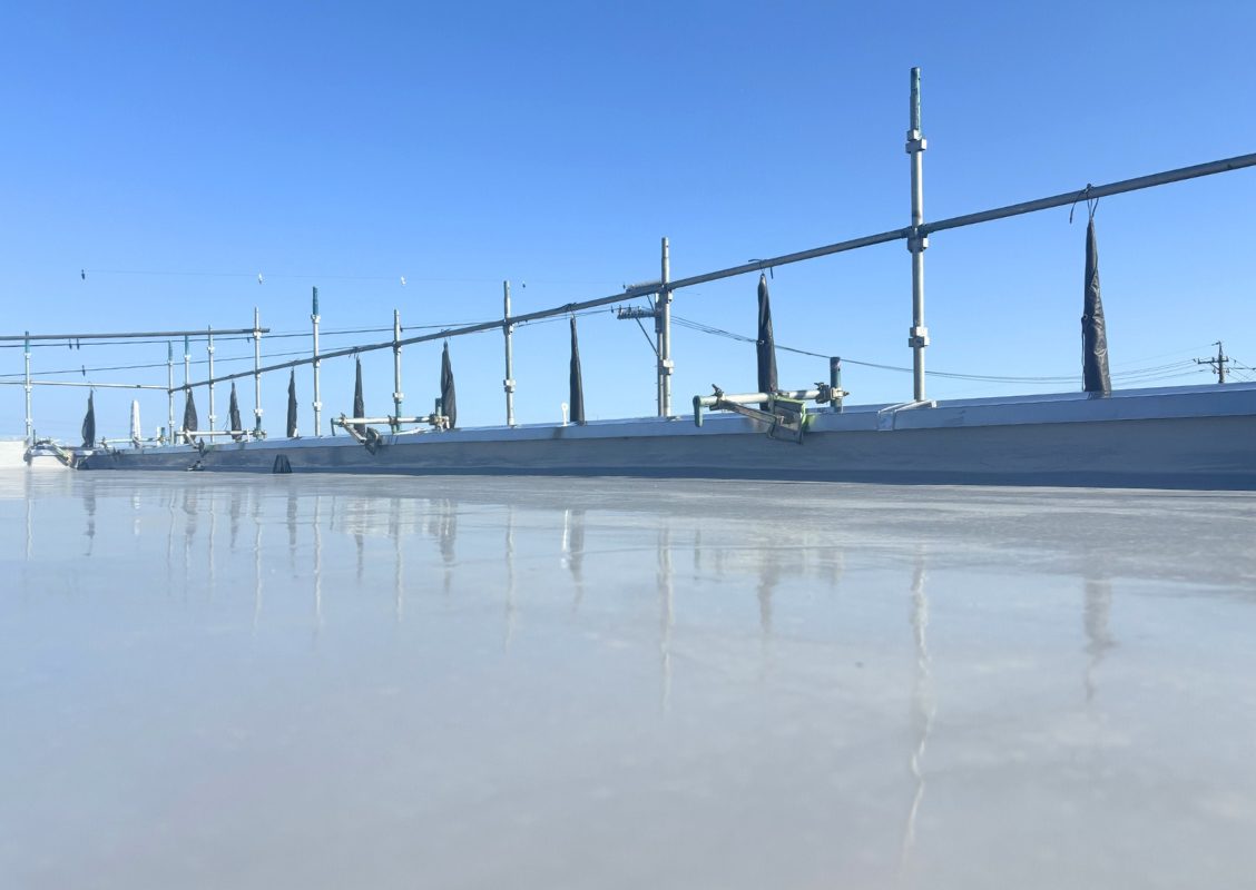 シートを貼って防水層を形成する工法です。滑らかな平面に適しています。