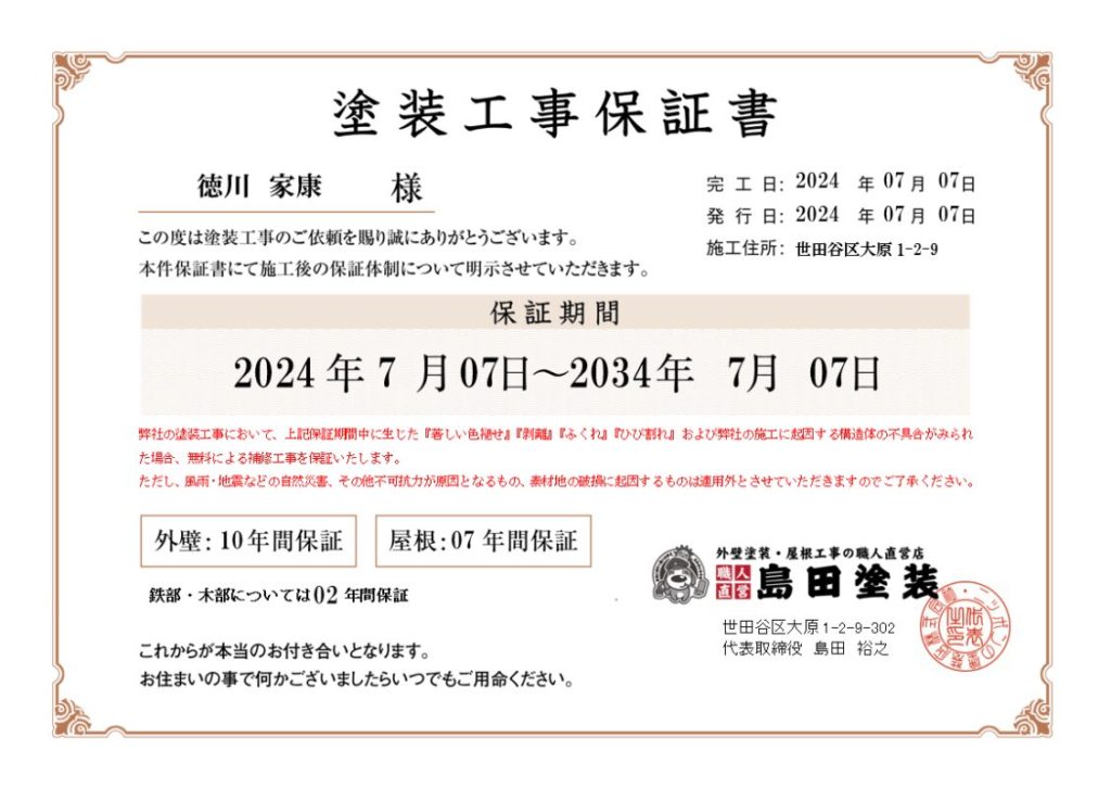 これらの保証から、島田塗装で施工をしていただいたお客様は、施工後の長い安心を受け取ることができます。