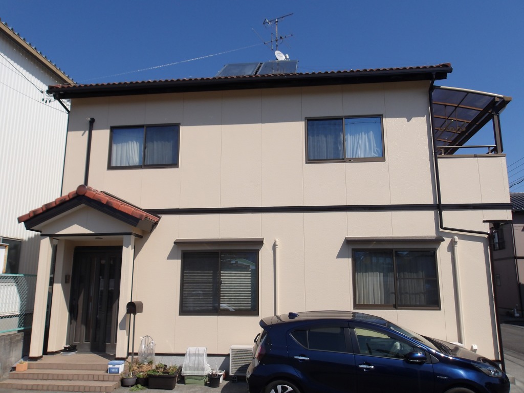 外壁の中塗りの後に、新田さんの好みの色で塗装し、ムラやダメ(塗り残し)が残らないよう気を付け、塗膜を厚くし、より耐久性を高めます。そして新田さんに喜んで頂くよう、心を込めて仕上げ塗りを行っていきます。