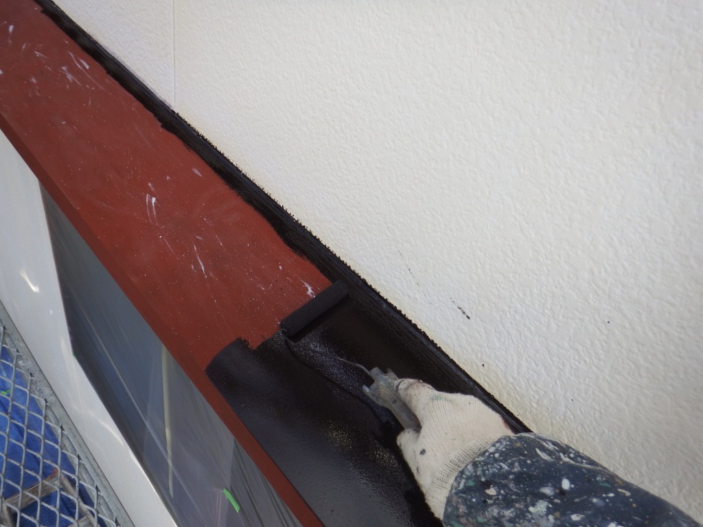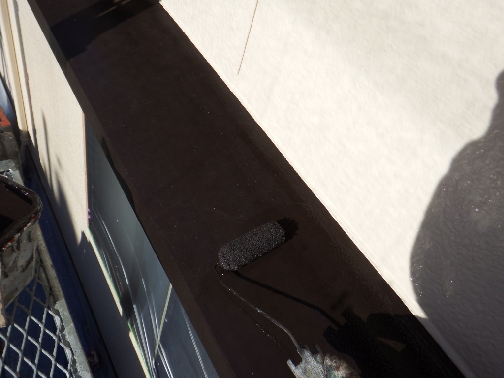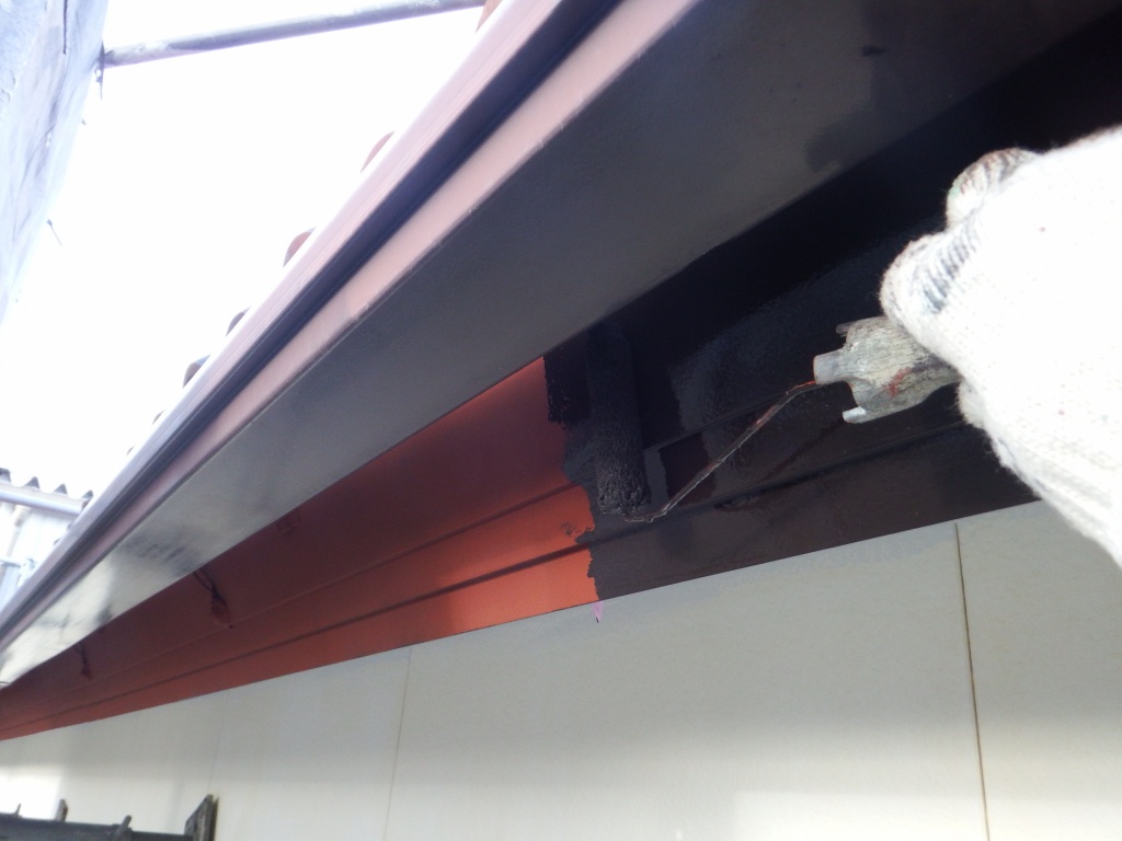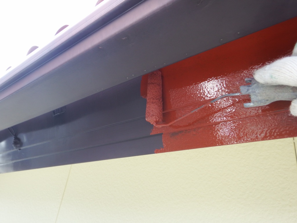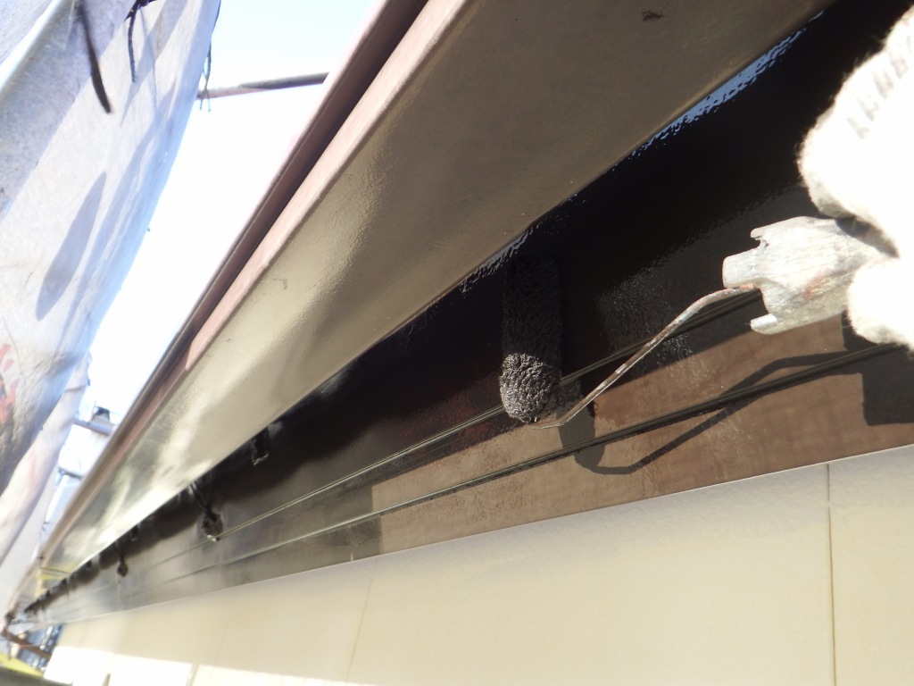 破風も雨樋や雨戸と同じように一緒の材料を使用し、同じ色で塗っていきます。(色変えをする箇所もあります)最初に錆止め、プライマーを塗り、その後に中塗り、上塗りを行ってキレイに仕上げていきます。