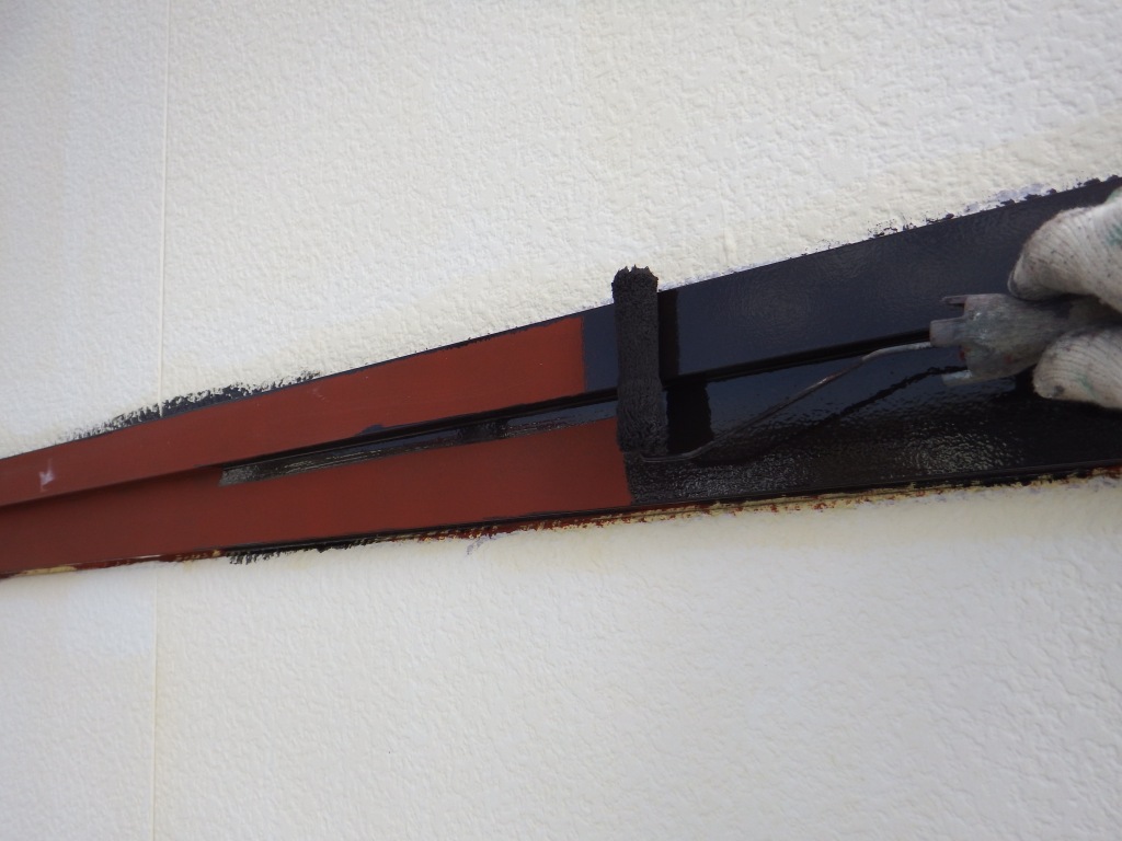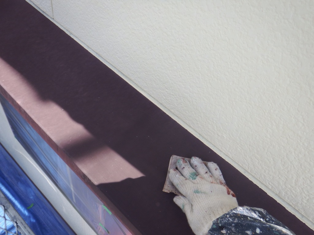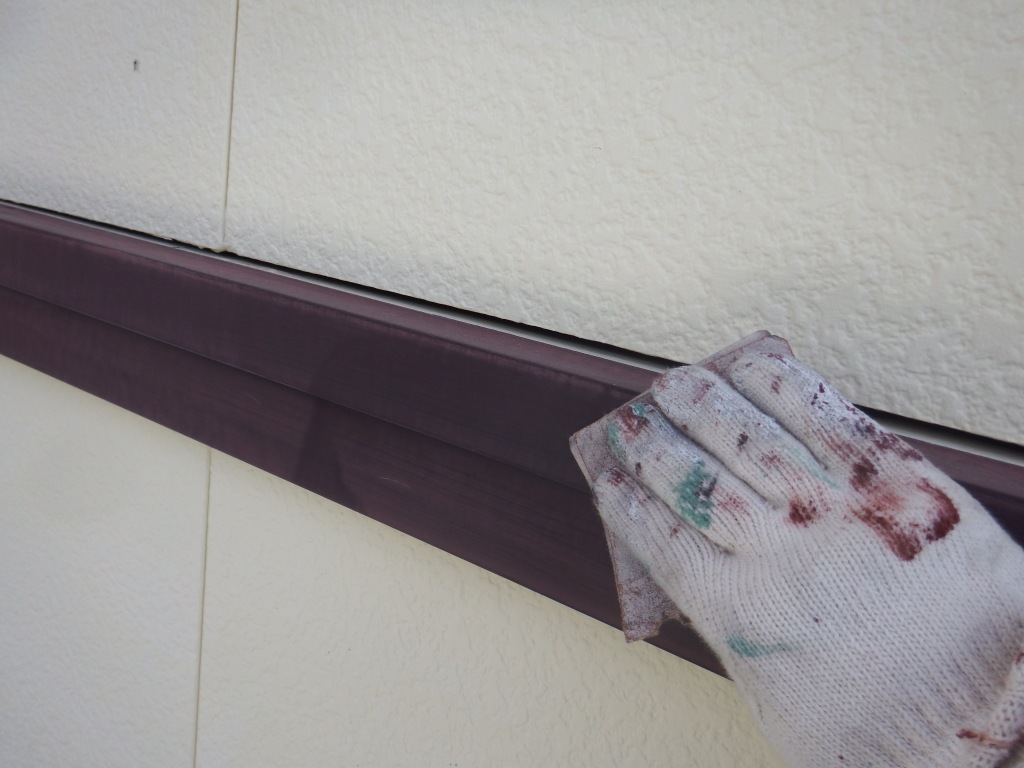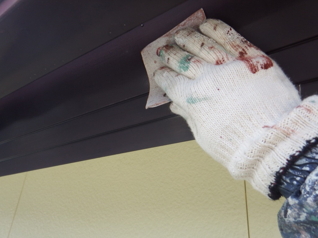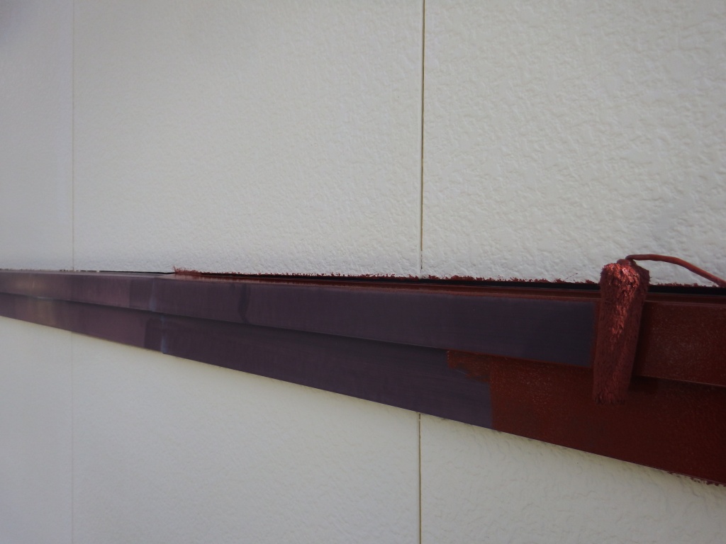 お家の1階、2階の境や縦角部にある板部を塗装していきます。ケレン→錆止め→中塗り→上塗りの工程でお家の周りをぐるっと塗っていきます。