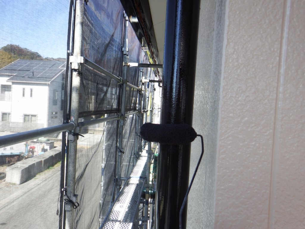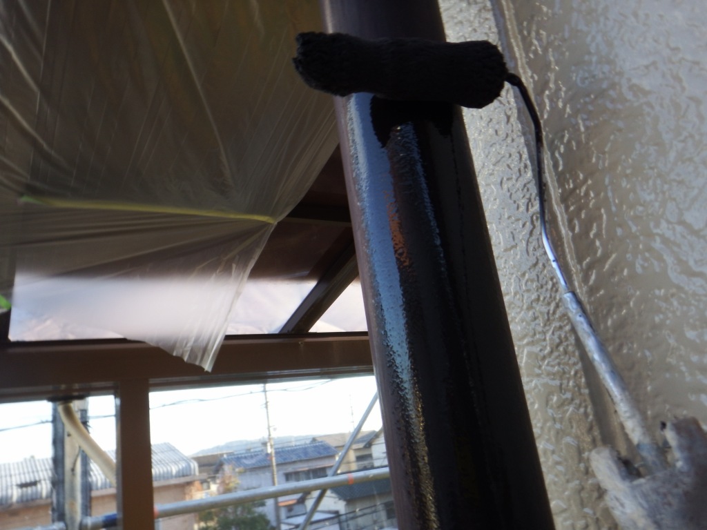 雨樋は、腐食はしませんが、陽に当たり続けて色褪せていきます。色褪せた雨樋は、景観的にあまり良くない為、外壁と一緒に刷毛でキレイに塗っていきます。