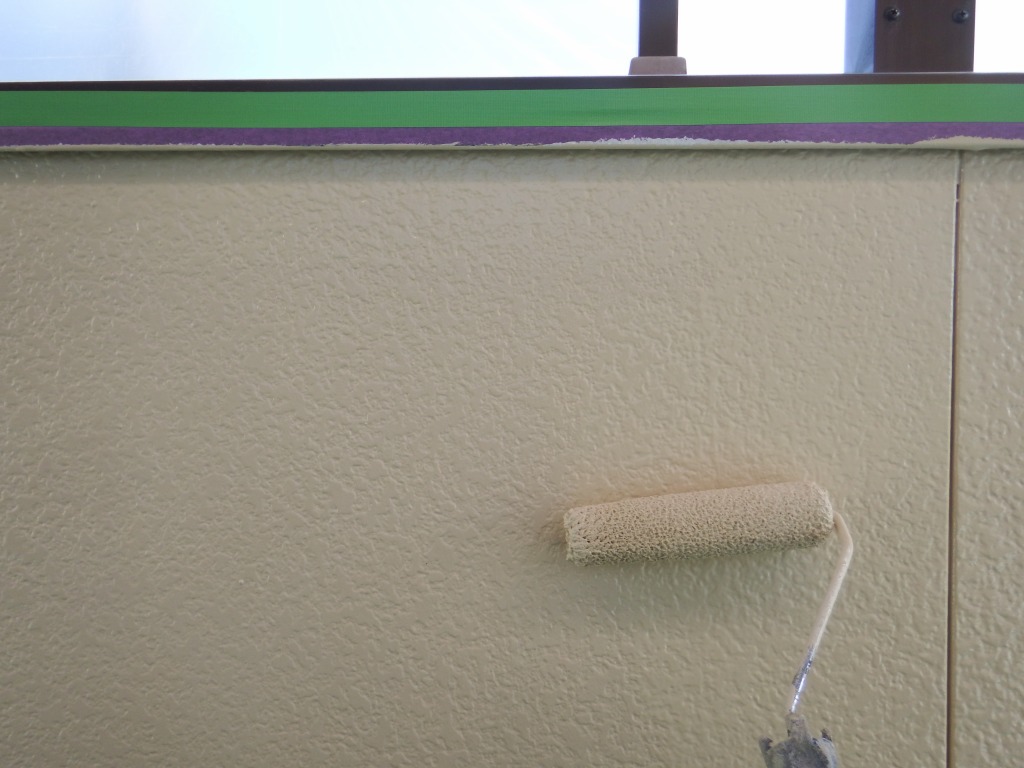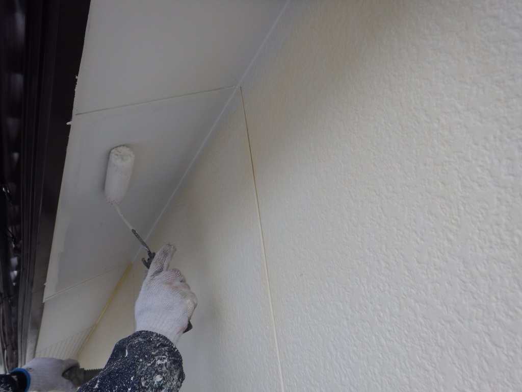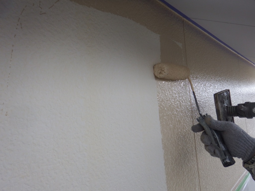 外壁の下塗りになります。微弾性フィラーを塗っているところです。塗装表面にある細かなひび割れ、細かい穴等をカバーできるすぐれもの。これ一つで下地調整、下地強化機能があります。