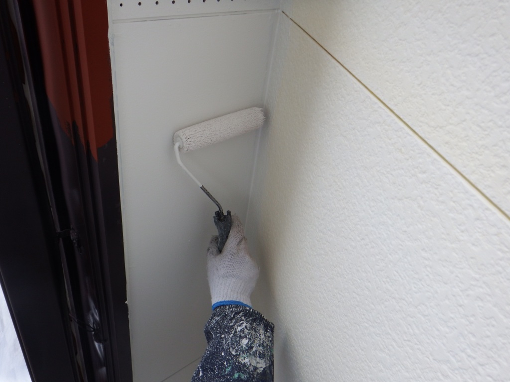 軒天を塗る際、まず始めに隙間や穴等が無いか確認します。もしも、ありましたら軒天を新しく張り替えるか、専用の材料で軒天の隙間を埋めていきます。その工程を行い、中塗りに入ります。中塗りは、防カビなどが付いている材料で塗っていきます。外壁、屋根とも違う材料を使います。