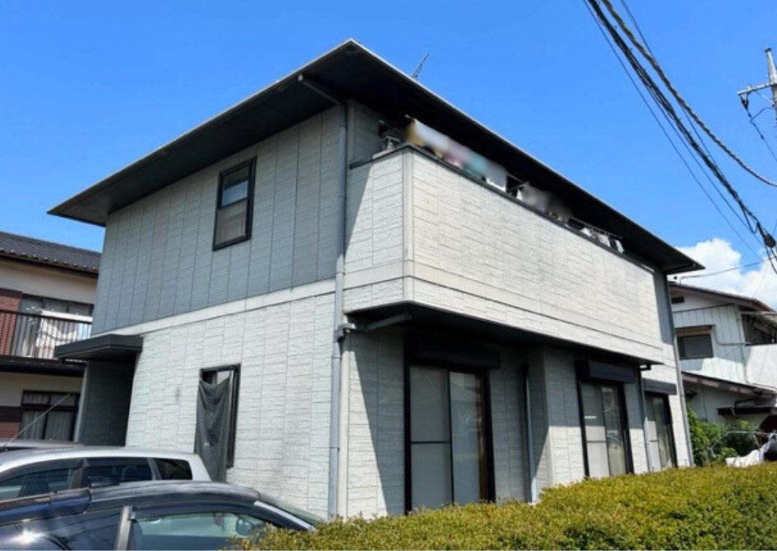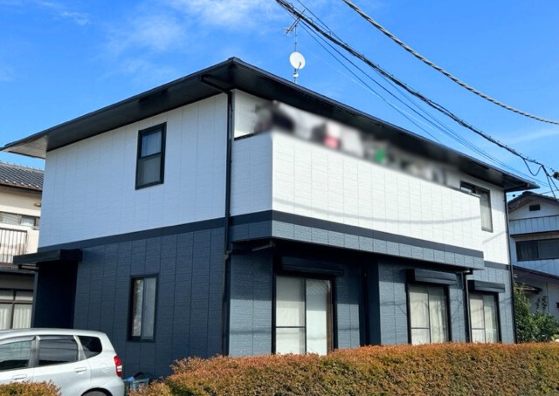 外壁はお客様のご要望で上下2色の色分け塗装を行いました。写真でもお分かりいただけるようにまるで新築の家と間違えるよなきれいな仕上がりになりました。附帯部の塗料も全体のイメージから黒では重くなるため外壁の色をベースに黒に近いグレー系統で仕上げました。一見黒に見えますが深みのある濃いめの青みがかった濃彩色です!