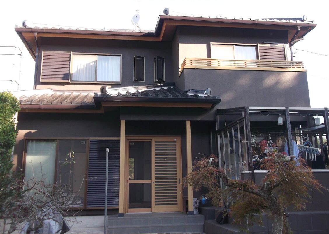 こちらのお宅は、外壁の色を艶消しのチャコール系で塗りました。軒天はアクセントカラーとするため、そのままの色で、透明な塗料を塗り、アクセントカラーとして活用しました。あえて色をたくさん使わずまとめる事で、とても重厚感のある仕上がりとなりました。とても満足していただき、大変うれしく思います。