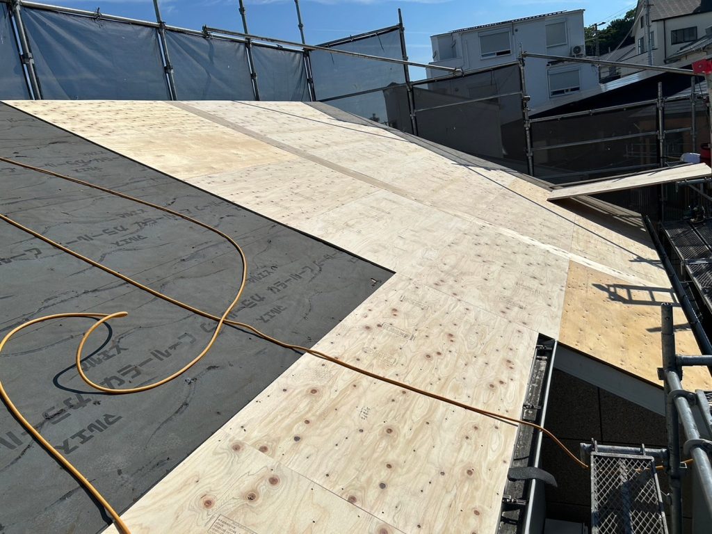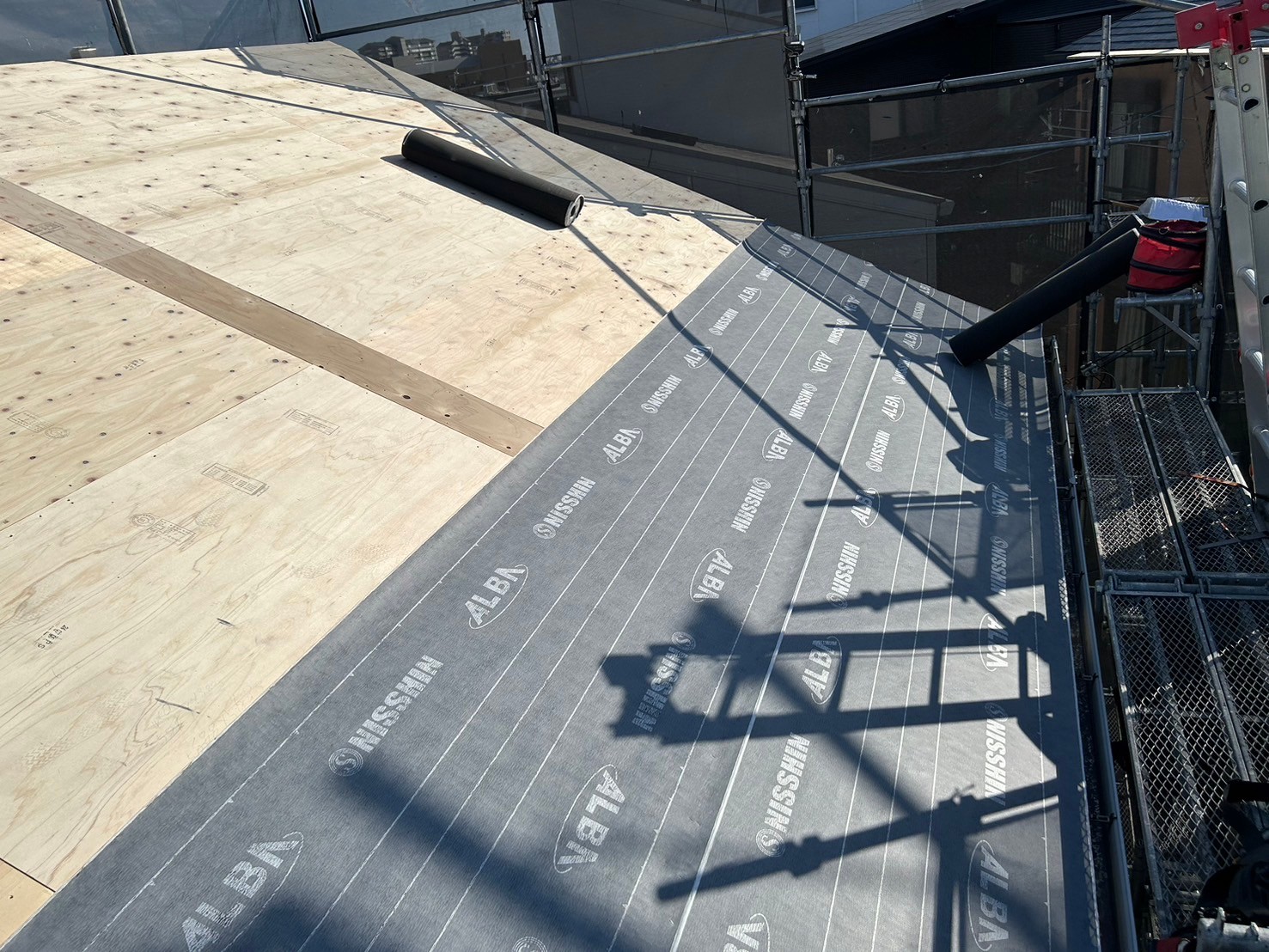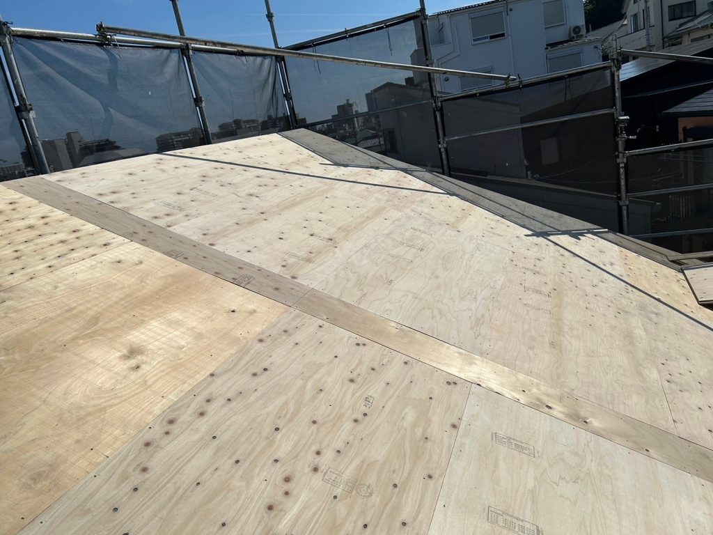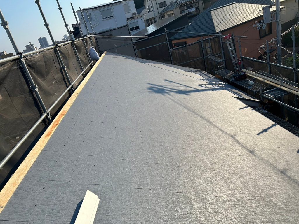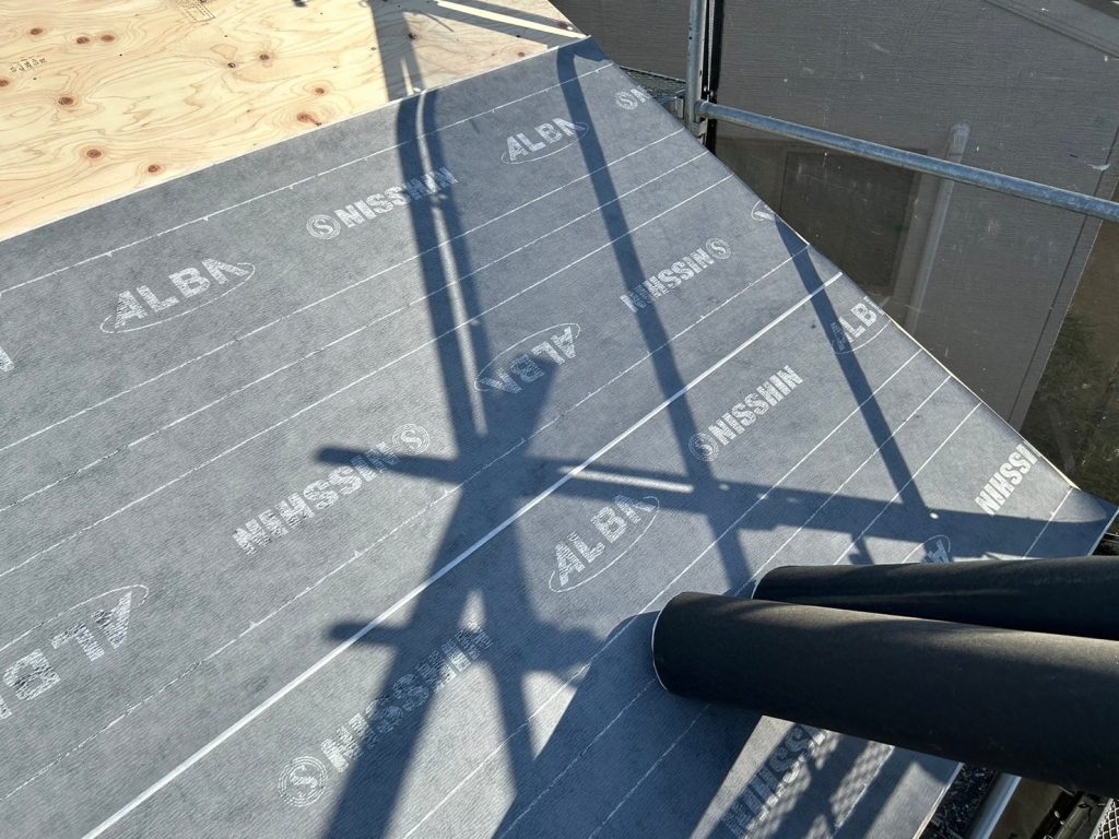 ルーフィングシートは、防水性・湿気の吸収等機能を持ち合わせていますので屋根工事では、必須な工程となります。