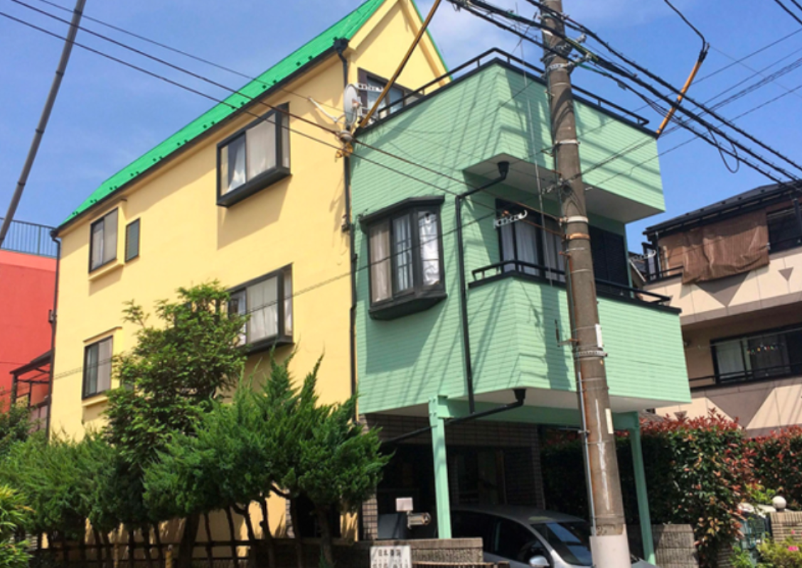 大田区池上の住宅をイエローとグリーンで外壁塗装。発色よく輝き、明るく鮮やかなお家になりました。