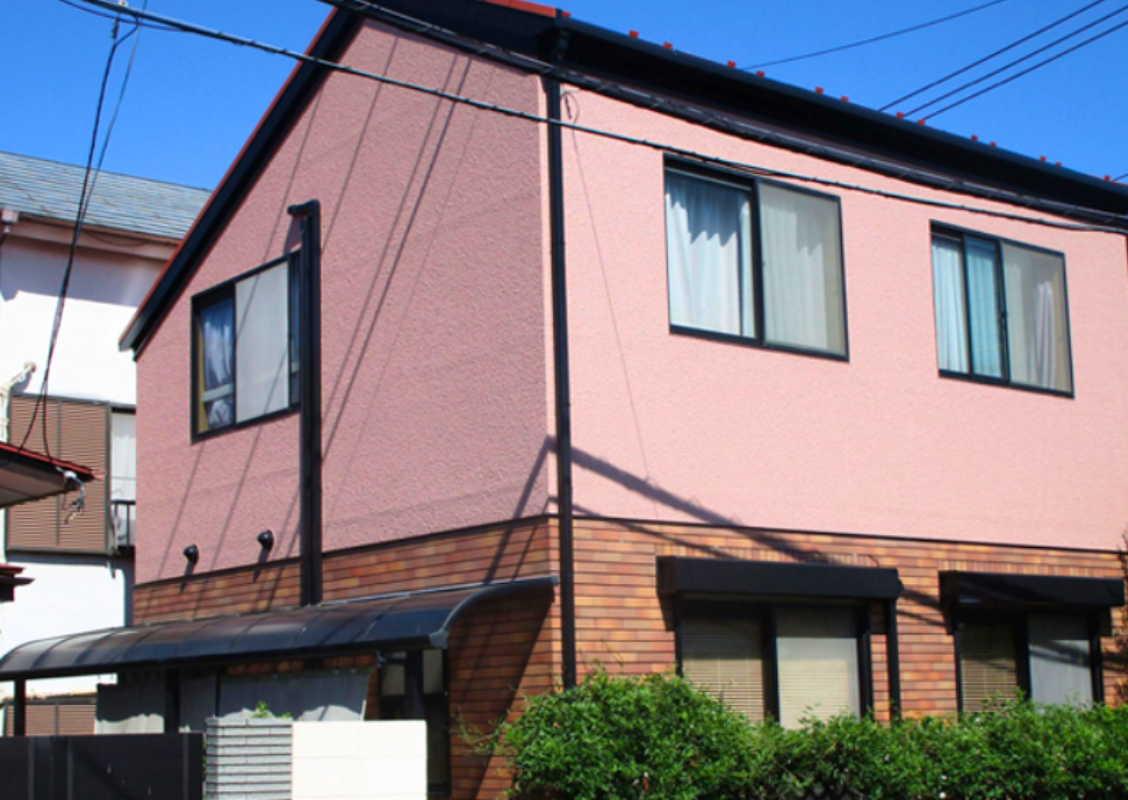 タイル壁とモルタル壁のおしゃれな住宅をピンクで外壁塗装。レンガ調のデザインとピンクの組合せが相性抜群で、さらに、おしゃれな住宅となりました。