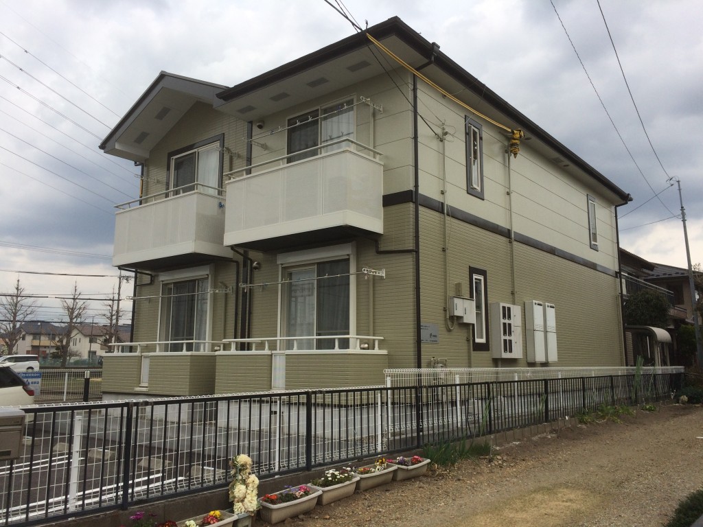 元々は、淡いベージュのアパートでしたが、築20年を過ぎてイメージを刷新したいとのご要望で、おしゃれにしたいとのことで、グリーンを使用したツートンカラーをご提案させて頂きました。