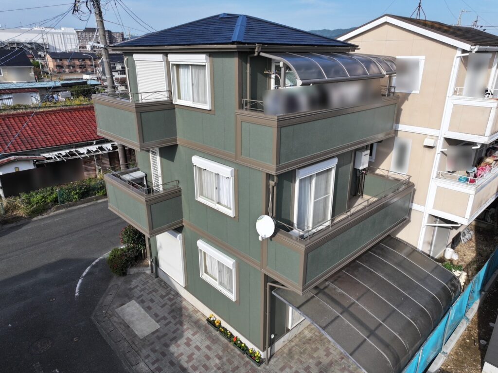 経年劣化による色あせや防水性の低下が見られたため、外壁にはKFケミカル「フッソUVコート(35-40B)」を採用し、高耐候性と上質な仕上がりを両立。